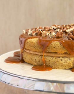 So, a little bit of time and a few dirty bowls later, you’ll have this gorgeous cake. We’re talking two layers of nutty cake with a caramel mousse filling. And, all of that is topped off with a caramel sauce and some toasted pecans. Oh. My. Word.